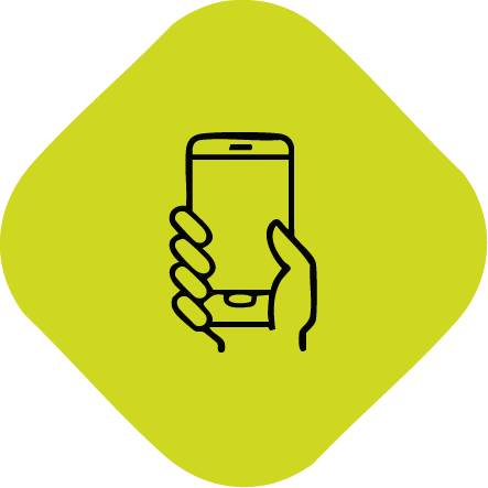 Icon of a hand holding a smartphone on a yellow background.